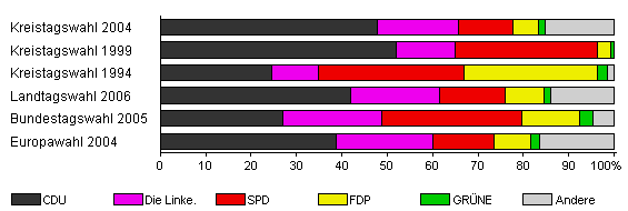 | Kreistagswahl 2004 | 43,2 | 47,7 | 17,9 | 12,2 | 5,6 | 1,3 | 15,3 | |