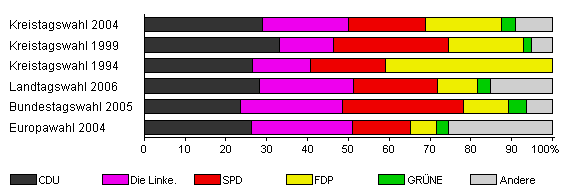 | Kreistagswahl 2004 | 44,1 | 29,0 | 21,0 | 18,8 | 18,8 | 3,3 | 9,1 | |