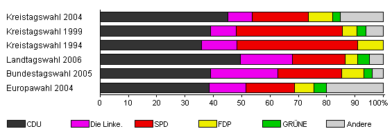| Kreistagswahl 2004 | 75,7 | 45,1 | 8,5 | 19,9 | 8,6 | 2,7 | 15,2 | |