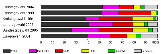 | Kreistagswahl 2004 | 51,7 | 52,7 | 14,7 | 12,0 | 6,2 | 3,0 | 11,4 | |