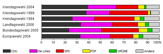 | Kreistagswahl 2004 | 42,5 | 38,9 | 24,3 | 18,7 | 5,3 | 1,4 | 11,4 | |