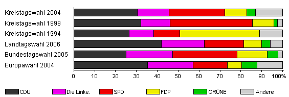 | Kreistagswahl 2004 | 53,4 | 30,4 | 15,2 | 26,8 | 10,4 | 4,1 | 13,0 | |