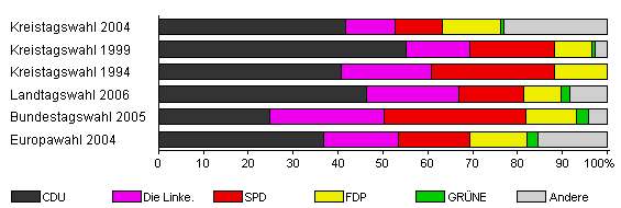 | Kreistagswahl 2004 | 50,0 | 41,8 | 10,9 | 10,5 | 12,9 | 0,8 | 23,1 | |