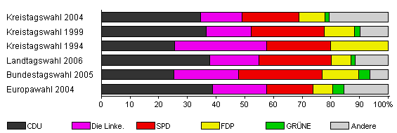 | Kreistagswahl 2004 | 54,2 | 34,6 | 14,4 | 19,8 | 9,1 | 1,5 | 20,6 | |