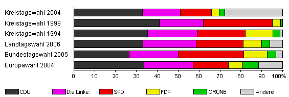 | Kreistagswahl 2004 | 46,4 | 32,8 | 18,3 | 14,8 | 3,6 | 2,9 | 27,5 | |