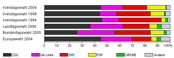| Kreistagswahl 2004 | 43,6 | 44,5 | 17,9 | 18,9 | 15,2 | 0,6 | 2,9 | |