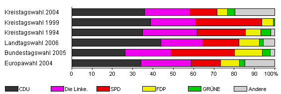 | Kreistagswahl 2004 | 43,9 | 35,7 | 22,4 | 13,4 | 5,3 | 3,6 | 19,6 | |