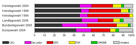 | Kreistagswahl 2004 | 50,1 | 45,6 | 12,2 | 21,7 | 8,7 | 2,4 | 9,4 | |