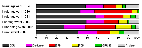 | Kreistagswahl 2004 | 57,3 | 48,0 | 17,4 | 12,0 | 6,6 | 2,9 | 13,0 | |