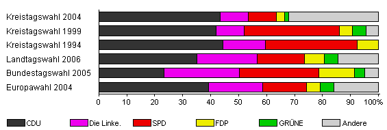 | Kreistagswahl 2004 | 74,1 | 43,3 | 10,1 | 10,0 | 3,0 | 1,5 | 32,2 | |