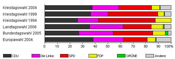 | Kreistagswahl 2004 | 42,2 | 37,6 | 21,0 | 25,9 | 6,3 | 0,6 | 8,6 | |