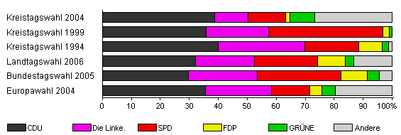 | Kreistagswahl 2004 | 56,4 | 38,8 | 11,5 | 12,9 | 1,6 | 8,5 | 26,6 | |