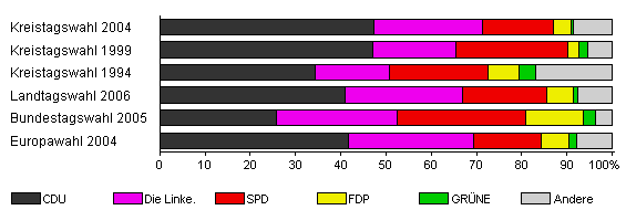 | Kreistagswahl 2004 | 42,9 | 47,4 | 23,8 | 15,8 | 3,8 | 0,7 | 8,5 | |