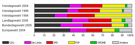 | Kreistagswahl 2004 | 45,4 | 35,9 | 12,4 | 21,0 | 23,8 | 1,7 | 5,2 | |