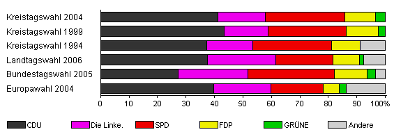 | Kreistagswahl 2004 | 54,1 | 41,2 | 16,6 | 27,9 | 10,9 | 3,4 | x | |