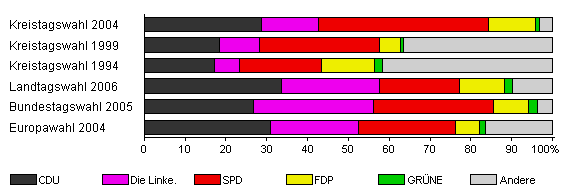 | Kreistagswahl 2004 | 40,3 | 28,6 | 14,1 | 41,7 | 11,4 | 1,0 | 3,2 | |