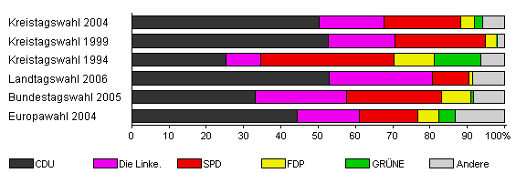 | Kreistagswahl 2004 | 58,9 | 50,3 | 17,4 | 20,4 | 3,9 | 2,0 | 5,9 | |