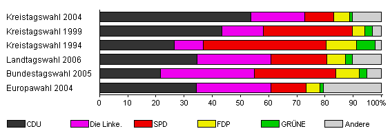 | Kreistagswahl 2004 | 45,0 | 53,8 | 18,9 | 10,3 | 5,6 | 1,1 | 10,4 | |