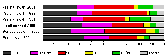 | Kreistagswahl 2004 | 41,4 | 27,9 | 14,3 | 32,8 | 3,5 | 11,9 | 9,6 | |