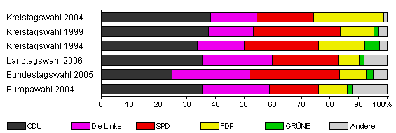| Kreistagswahl 2004 | 34,6 | 38,2 | 16,3 | 19,8 | 24,4 | x | 1,4 | |