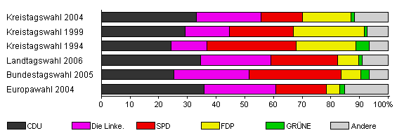 | Kreistagswahl 2004 | 39,5 | 33,1 | 22,5 | 14,5 | 16,8 | 1,2 | 11,8 | |