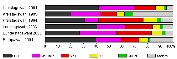 | Kreistagswahl 2004 | 49,6 | 41,6 | 28,1 | 16,5 | 6,6 | 2,0 | 5,2 | |