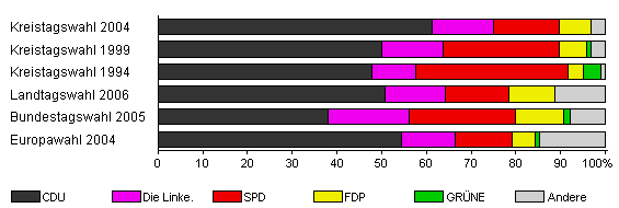 | Kreistagswahl 2004 | 38,4 | 61,3 | 13,8 | 14,5 | 7,3 | - | 3,1 | |