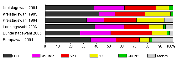 | Kreistagswahl 2004 | 56,0 | 38,0 | 23,9 | 24,5 | 10,4 | 3,2 | x | |
