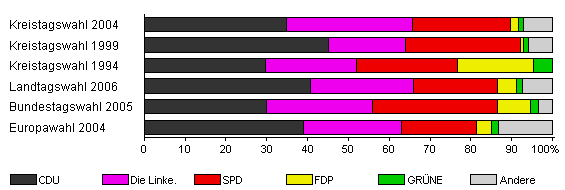 | Kreistagswahl 2004 | 32,5 | 34,8 | 30,9 | 23,9 | 2,0 | 1,3 | 7,1 | |