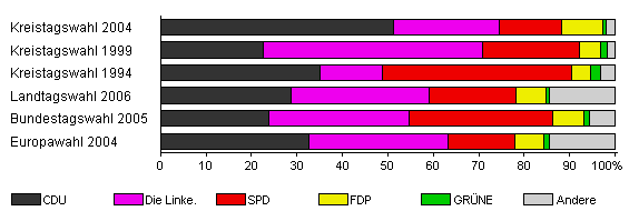 | Kreistagswahl 2004 | 40,3 | 51,2 | 23,3 | 13,7 | 9,0 | 0,9 | 1,9 | |