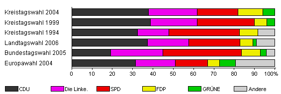 | Kreistagswahl 2004 | 45,4 | 37,7 | 24,1 | 20,1 | 12,1 | 5,9 | x | |