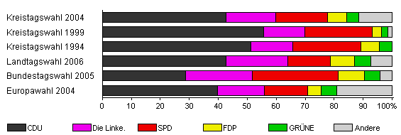 | Kreistagswahl 2004 | 58,0 | 42,6 | 17,2 | 18,0 | 6,5 | 4,2 | 11,5 | |