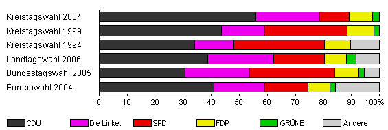 | Kreistagswahl 2004 | 44,8 | 55,9 | 22,7 | 10,5 | 8,5 | 2,4 | x | |