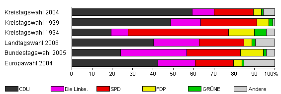 | Kreistagswahl 2004 | 55,7 | 59,2 | 10,9 | 19,4 | 3,8 | 1,1 | 5,6 | |