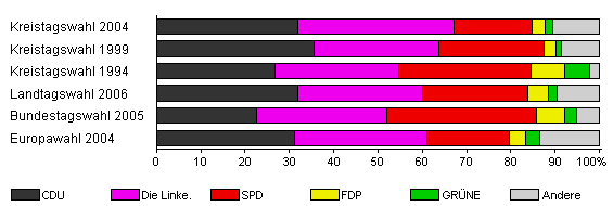 | Kreistagswahl 2004 | 27,4 | 31,9 | 35,2 | 17,8 | 2,8 | 1,8 | 10,5 | |
