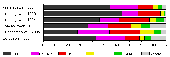 | Kreistagswahl 2004 | 44,8 | 54,2 | 22,5 | 12,3 | 4,3 | 3,2 | 3,4 | |