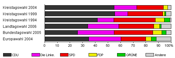 | Kreistagswahl 1999 | 50,6 | 55,4 | 10,3 | 27,6 | 1,5 | 1,1 | 4,0 | |