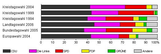 | Kreistagswahl 2004 | 74,0 | 42,0 | 30,2 | 18,3 | 4,6 | 0,3 | 4,6 | |
