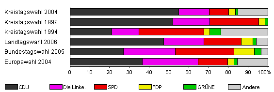 | Kreistagswahl 2004 | 64,1 | 55,0 | 15,3 | 9,8 | 3,4 | 1,4 | 15,0 | |