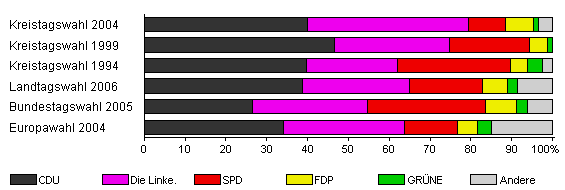 | Kreistagswahl 2004 | 43,9 | 40,0 | 39,4 | 9,1 | 6,8 | 1,3 | 3,5 | |