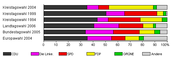 | Kreistagswahl 2004 | 55,6 | 35,0 | 9,4 | 8,2 | 36,2 | 2,6 | 8,6 | |