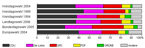 | Kreistagswahl 2004 | 48,4 | 36,6 | 26,7 | 17,6 | 8,2 | 1,8 | 9,1 | |