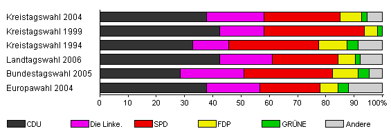 | Kreistagswahl 2004 | 52,9 | 37,7 | 20,3 | 27,1 | 7,6 | 1,9 | 5,4 | |