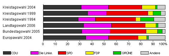 | Kreistagswahl 2004 | 44,4 | 31,1 | 22,3 | 27,5 | 11,1 | 1,4 | 6,6 | |