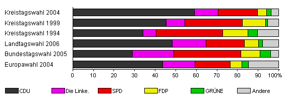 | Kreistagswahl 2004 | 56,5 | 59,1 | 11,5 | 19,2 | 4,3 | 2,2 | 3,6 | |