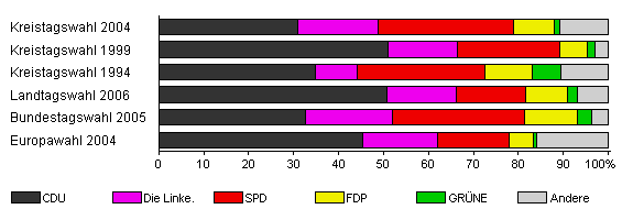 | Kreistagswahl 1994 | 88,8 | 34,8 | 9,4 | 28,3 | 10,5 | 6,5 | 10,5 | |