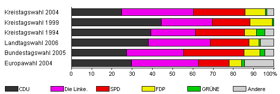 | Kreistagswahl 2004 | 65,6 | 24,7 | 35,5 | 25,5 | 10,1 | 0,8 | 3,4 | |