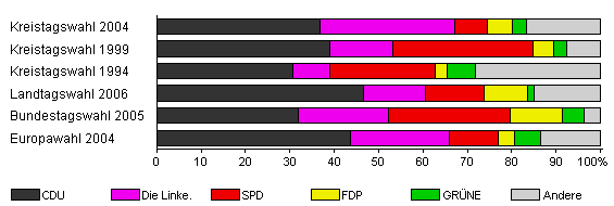 | Kreistagswahl 2004 | 65,3 | 36,7 | 30,5 | 7,3 | 5,7 | 3,0 | 16,7 | |