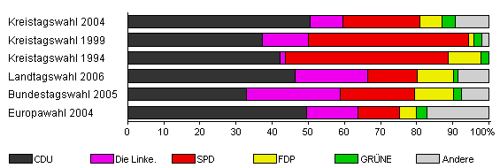 | Kreistagswahl 2004 | 61,0 | 50,4 | 9,1 | 21,4 | 6,0 | 3,7 | 9,4 | |