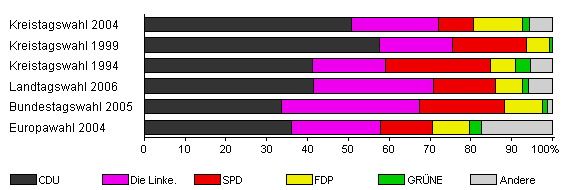 | Kreistagswahl 2004 | 53,2 | 50,7 | 21,4 | 8,5 | 12,1 | 1,6 | 5,7 | |